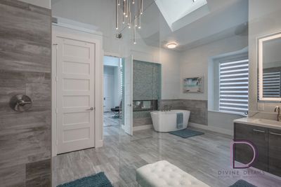 The bathtub and shower were strategically relocated to optimize the space. For added privacy and sound control, a wall was cleverly placed between the bedroom and bathroom. The bulky 3-sided fireplace was replaced with a sleek, 2-sided modern fireplace featuring captivating teal glass, adding a touch of contemporary elegance.