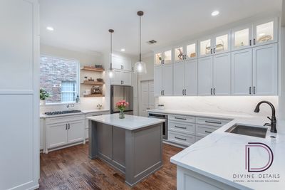 The dark oak cabinets and granite countertops were replaced with lighter finishes, creating a more open and airier feel. Open shelving with lighting was strategically placed to enhance the sense of spaciousness further. The refrigerator was relocated to a more convenient spot, eliminating the need to navigate around the island to access it. The pantry was redesigned to maximize storage and accessibility, featuring roll-out drawers and adjustable shelves.
