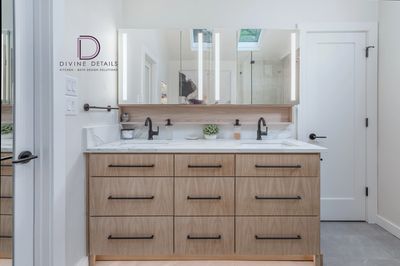 A layered lighting scheme, incorporating recessed lights, lighted mirrors, undercabinet lighting, and a lighted niche, creates a warm and inviting ambiance. By combining earthy materials, the client's vision of a stunning, functional, and down-to-earth bathroom has been brought to life.
