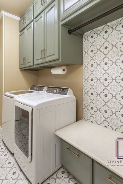 The transformation began by widening the kitchen doorway, expanding from a restrictive 6 feet to a spacious 13 feet. This instantly opened the layout and fostered a more connected feel with the family room. Gone was the unused bar, replaced by a sleek pantry tucked away in a nearby hallway. In its place, a majestic double oven cabinet took center stage, featuring a large single oven and a convenient Advantium oven above. A bulky peninsula gave way to a functional island, offering ample seating, a deep single-bowl sink with a clever sponge drawer, and hidden gems, such as a dishwasher and dual trash bins. A touch to activate faucet with a matching soap dispenser added a touch of modern convenience, while air switches controlled the garbage disposal and pendant lights, infusing a layer of tech-savvy magic. Every inch of this kitchen was meticulously designed for maximum functionality and style. Clever cabinetry optimizers ensured clutter-free zones for everything from stools and spices to oils and utensils. Holiday dishes found a comfortable home in a dedicated set of upper cabinets. The backsplash, adorned with an arabesque dance of color and shape, became a captivating focal point. A glass-doored beverage center proudly displayed cherished glasses and mugs, while the breakfast nook's new storage bench beckoned with an invitation for coffee and conversation. The once-dated brick fireplace found new life with Austin Stone and a unique mantle sourced from Canton, adding a touch of characterful charm. Even the laundry room received a makeover, boasting deeper cabinets, a handy bench, and a playful, patterned tile underfoot, making chores a little more enjoyable. Layered lighting, from recessed fixtures to pendant drops and under-cabinet illumination, bathed the space in a warm and inviting glow.