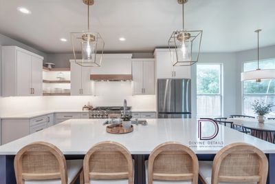 Light & Bright Transformation: Dark cabinets were replaced with light-colored ones, and a stunning blue island was introduced as a bold focal point. This combination, along with the light-colored backsplash, creates a bright and inviting atmosphere that sparks creativity and inspires countless future gatherings.