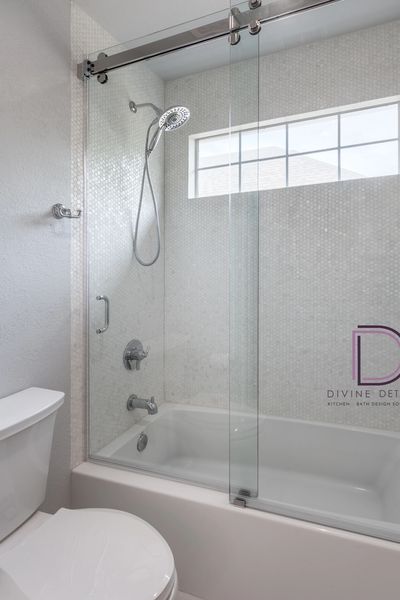 The once-wasted space beneath the vanities was transformed into a haven of storage, complete with luxurious chrome and acrylic hardware that added a touch of grown-up glamour. Bland mirrors were replaced with trendy, round, lighted ones, revealing a stunning butterfly wallpaper that added a whimsical touch. The real showstopper is the shower and tub. Gone is the dullness, replaced with shimmering opalescent tile that sparkles like a dream whenever she steps in.