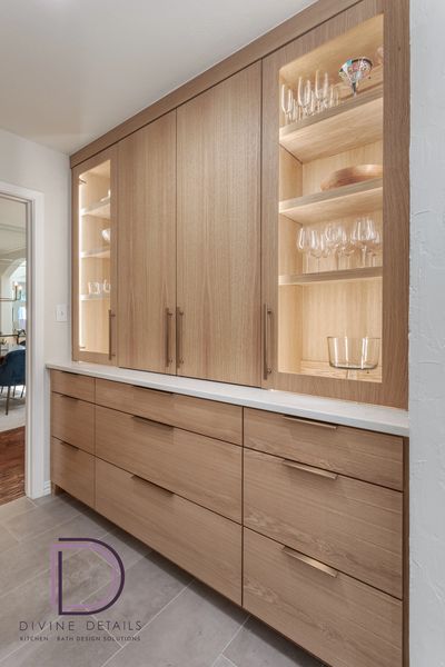 The dark countertops and backsplash were replaced with stunning Vicostone Elbert Quartz, a lighter material that reflects light and creates an airy feel. The dated cabinets were replaced with sleek, slab-front white oak cabinets. Gold tab pulls add a touch of modern elegance.