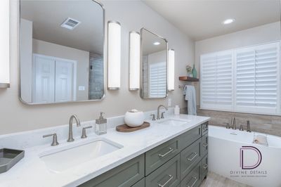 Limited storage in the vanity left the client feeling frustrated and cramped. Cabinetry was transformed into a sleek haven of drawers, maximizing every inch for convenient access. The bulky cultured marble tub, though charming, ate up precious space. It was replaced with a stunning freestanding tub, complete with a deck-mounted faucet for a touch of elegance. The shower received a gentle expansion, and built-in niches provided ample storage for essentials and a secure footing for shaving. Even the closet got a luxurious makeover! A new cabinet offered dedicated space for clothes, shoes, and handbags, along with a countertop for jewelry and glasses. A hidden gem? A pull-out laundry bin makes chores a breeze. Light played a starring role, with recessed lights, sconces, and a new lighted makeup mirror providing ample illumination for any task, while remaining dimmable for a calming bath time ambiance. The beautiful new cabinet color adds a final touch of sophistication and a style that is enviable.