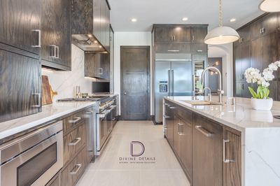The cabinetry is custom-built, featuring slab-style, inset doors with modern, masculine hardware. Attention to detail elevates the ordinary to the extraordinary. In this project, the seamless continuation of the wood grain from one cabinet to the next is exceptional. The inset cabinets offer a tight reveal. These two elements are only noticed when they are done incorrectly, but in this kitchen, they provide a feeling of comfort and sophistication.