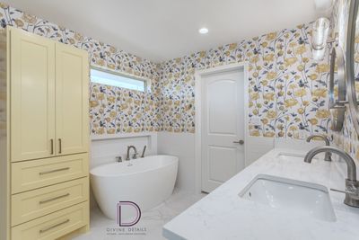 The entire space underwent a complete transformation, including the addition of a private water closet. The alcove tub and separate shower were replaced with a freestanding tub and a spacious walk-in shower. Two small closets were merged into a large, shared closet, and separate vanities were combined into one with practical cabinetry. The dark colors were replaced with whites and yellow, accented with a touch of blue. The result is a cheerful and energetic bathroom that perfectly suits the homeowners' preferences!